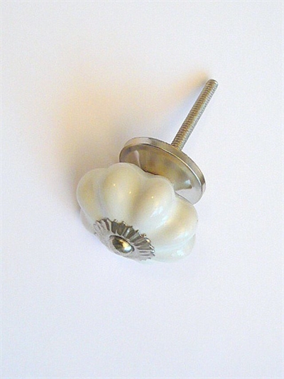 Hvid porcelænsknop m. riller og forkromet metal, stor.