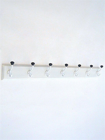 Klassisk knagerække m. 7 hvidlak. metal knager m. sorte porcelænsknopper på hvidt, profileret bræt m. lige ender - 90 cm.