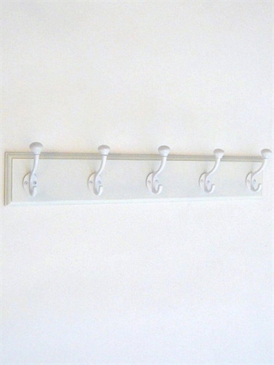Klassisk knagerække m. 5 hvidlak. metal knager m. hvide porcelænsknopper på hvidt, profileret bræt m. lige ender - 60 cm.