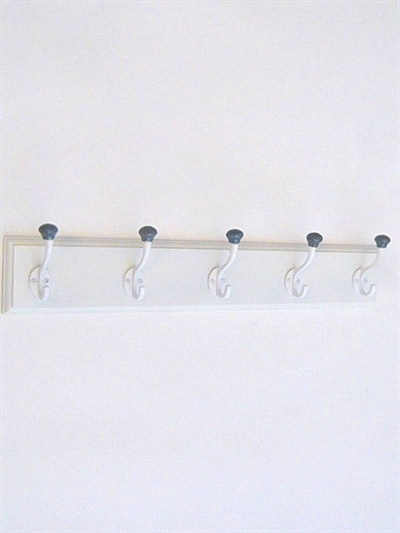 Klassisk knagerække m. 5 hvidlak. metal knager m. grå porcelænsknopper på hvidt, profileret bræt m. lige ender - 60 cm.