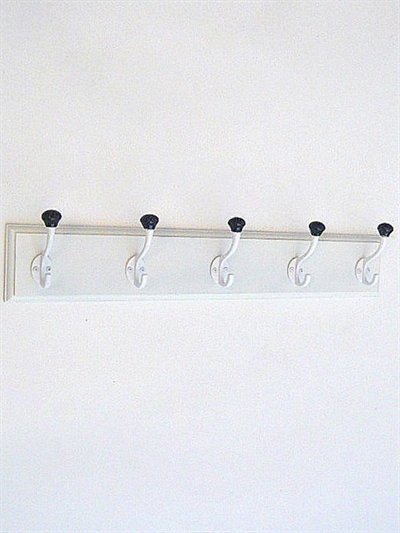 Klassisk knagerække m. 5 hvidlak. metal knager m. sorte porcelænsknopper på hvidt, profileret bræt m. lige ender - 60 cm.