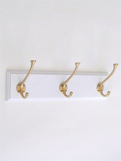 Klassisk knagerække m. 3 store børstede massive messingknager m. 4 skruehuller på hvidt, profileret bræt m. lige ender - 40 cm.