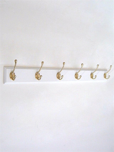 Klassisk knagerække m. 6 store børstede massive messingknager m. 4 skruehuller på hvidt, profileret bræt m. lige ender - 90 cm.
