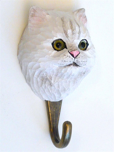 Naturtro perserkat knage, udskåret håndmalet træ m. patineret messingkrog og ophængsbeslag på bagsiden.