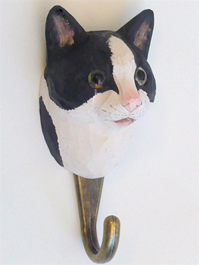 Naturtro sorthvid kat knage, udskåret håndmalet træ m. patineret messingkrog og ophængsbeslag på bagsiden.