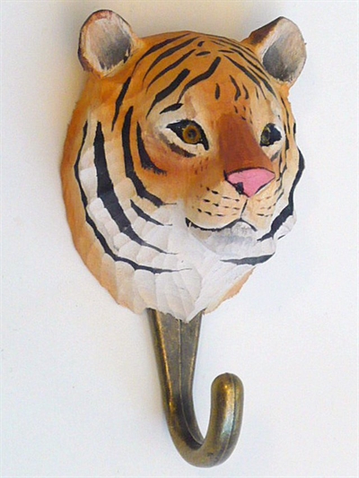 Naturtro tiger knage, udskåret håndmalet træ m. patineret messingkrog og ophængsbeslag på bagsiden.